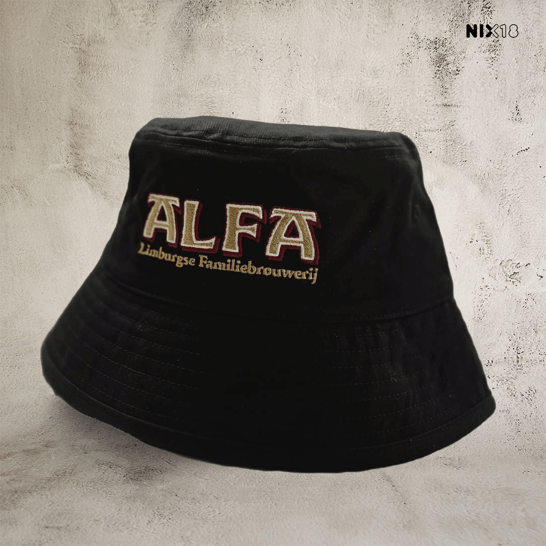 Draag je liefde voor Alfa Bier uit met deze stijlvolle en kwalitatieve zwarte bucket hat.